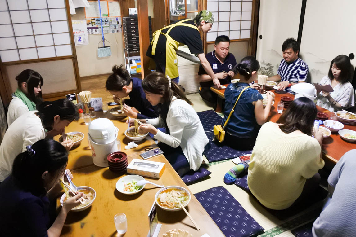 本場の喜多方ラーメンに舌つづみを打つ参加者の皆さん。