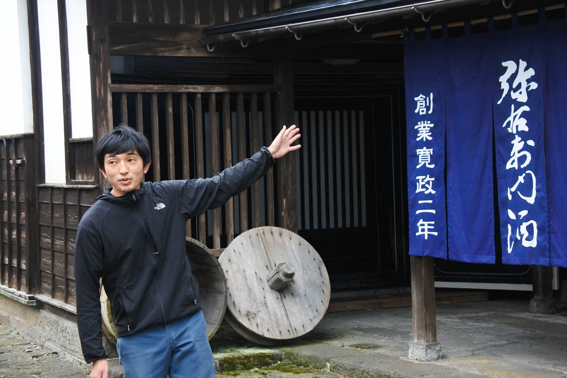 いかにも酒蔵!という趣ある佇まいにスマホのカメラを向ける手が止まらない様子。杜氏の佐藤哲野さんの案内で蔵の中にお邪魔しました。