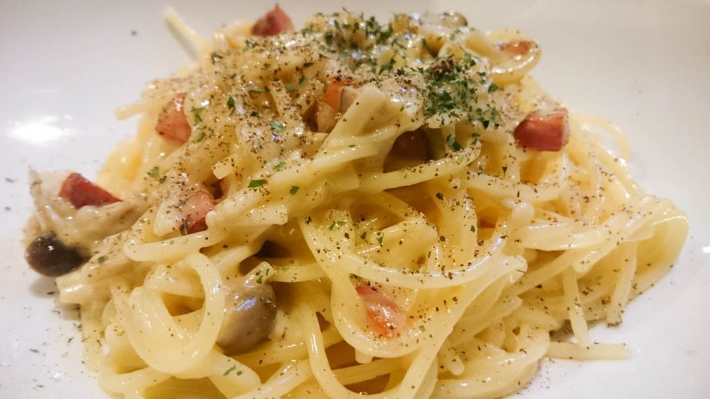 今回写真は用意出来ませんでしたが、この時期はたしか、千本桜にちなんだ季節限定メニューもあったはず??パスタも、季節ごとに色んなメニューが出てきます。そんな中でも定番メニューになっていてイチオシなのは、この「岡田さんの青卵を使ったカルボナーラ」。